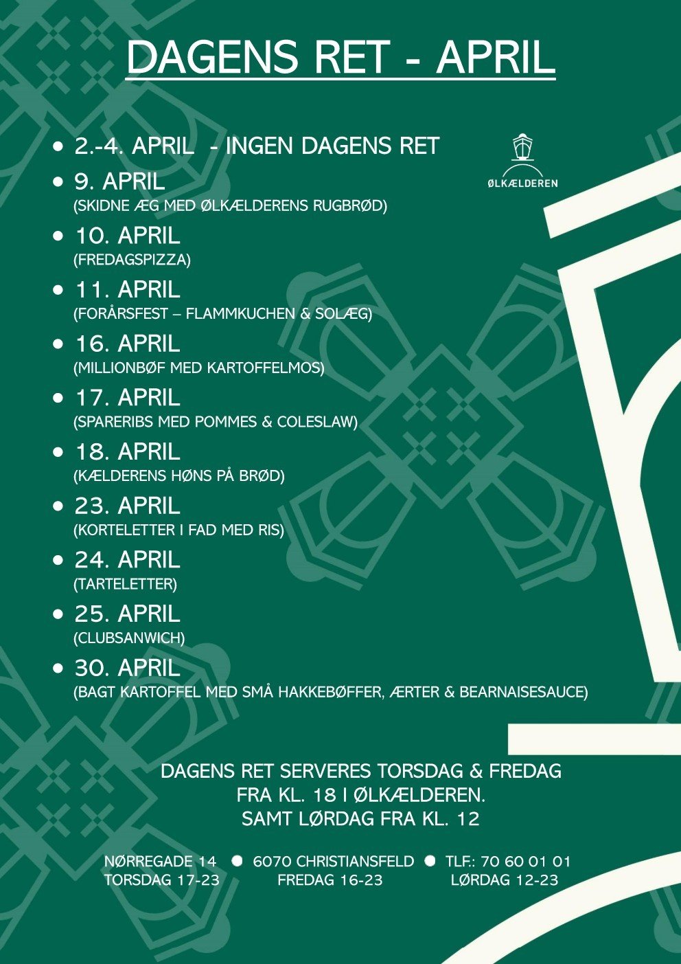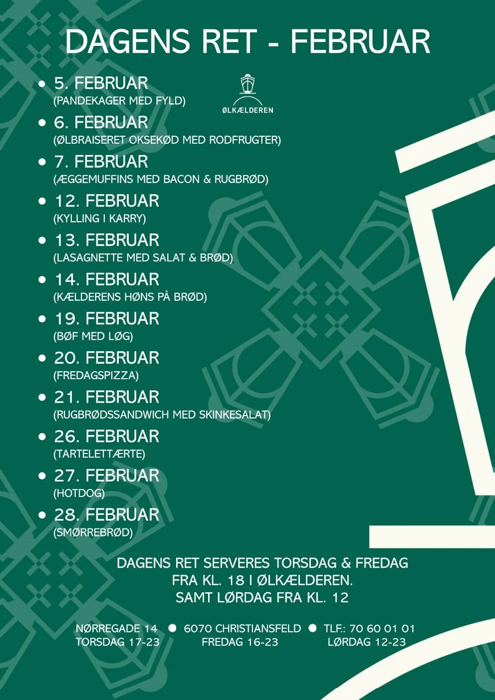 Fremover tilbyder vi dagens ret om aftenen torsdage og fredage samt frokost på lørdage (se mere på vores Facebook-side).