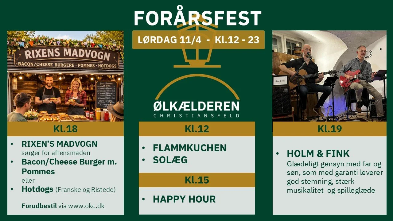 Vi har bestilt forårsvejr og sætter scenen til en fantastisk dag, fyldt med hygge og god stemning i gården og i kælderen.